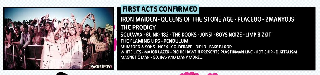 Juntos a estos, los Limp Bizkit de Fred Durst y cía, Placebo, las dos versiones de los hermanos Dewaele, con 2ManyDJ’s y Soulwax, la actuación de The Prodigy o el proyecto del cantante de Sigur Rós, Jónsi, son de las actuaciones centrales de la lista facilitada. Eso sí, también encontramos a The Kooks, The Flaming Lips, NOFX, Goldfrapp, Hot Chip, Digitalism y un largo etcétera que puedes comprobar pulsando aquí.