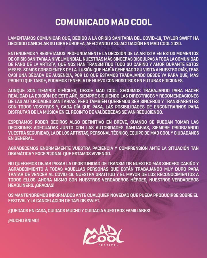 Así abría Taylor Swift el post donde explicaba que sus fechas por Estados Unidos y Brasil se aplazan hasta el 2021, aunque hasta finales de año no se conocerán. Una cancelación que afecta a grandes festivales europeos que ha habían anunciado previamente sus cancelaciones como Roskilde o Rock Werchter.